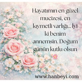 Sen bir annesin evimizde yuva kuransın, cebimizde resim, bu güzel resim ailemiz için, doğum günün kutlu olsun anneciğim. Anneler çiçek gibidir, onları hep mis kokulu yerlerde görebilirsin, senin için her zaman var olduklarını ve seni düşündüklerini bilirsin. Doğum günün kutlu olsun bir tanecik canım annem!