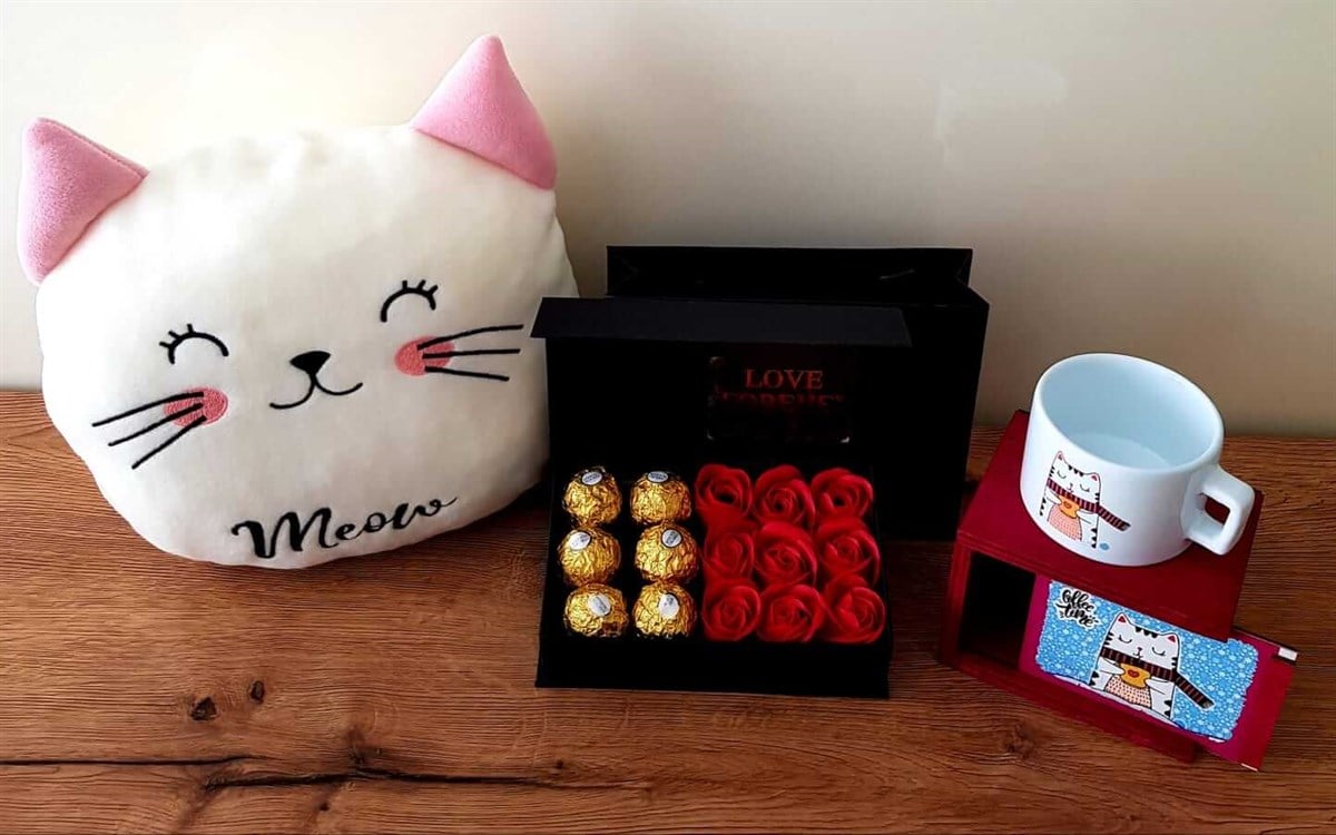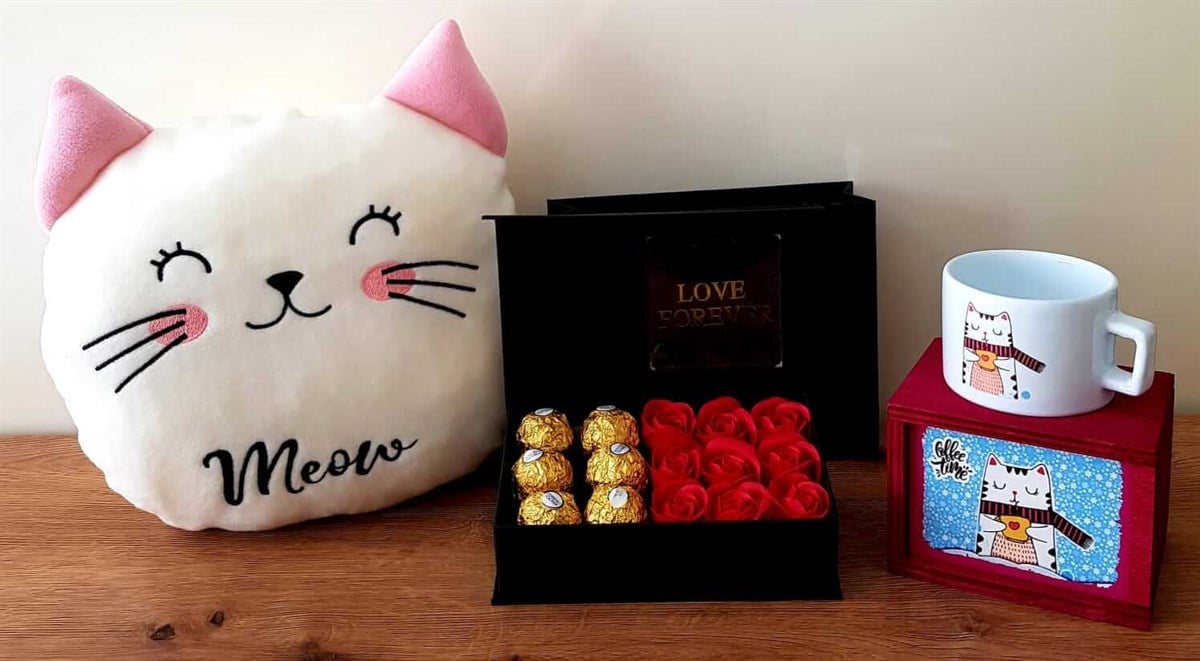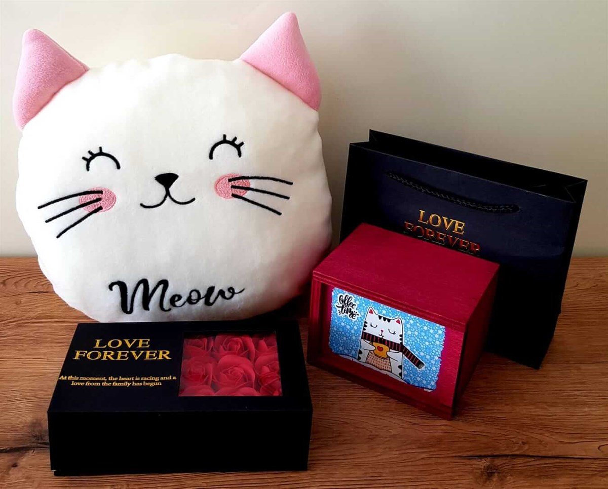 ÜRÜN ÖZELLİKLERİ; Pelüş Kedi  yastık polar kumaştan üretilmiştir. İçi elyaf dolgulu olarak gönderilmektedir. Pelüş Kedi yastık 30cm x 30cm ebatlarındadır. Kutu ahşap malzemeden imal edilmiştir. Baskı kalitesi yüksek ve canlı renk tonlarına sahiptir. Kutu 12cm genişlik 10cm derinlik ve 9.5cm yüksekliğindedir. Kupa birinci sınıf porselen malzemeden imal edilmiştir. Baskı kalitesinin ömrü acısından elle yıkama tavsiye edilir.
